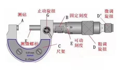 2)左手持尺架(C),右手转动粗调旋钮D使测杆F与测砧A间距稍大于被测物,放入被测物,转动保护旋钮D′到夹住被测物,直到棘轮发出声音为止,拨动固定旋钮G使测杆固定后读数。